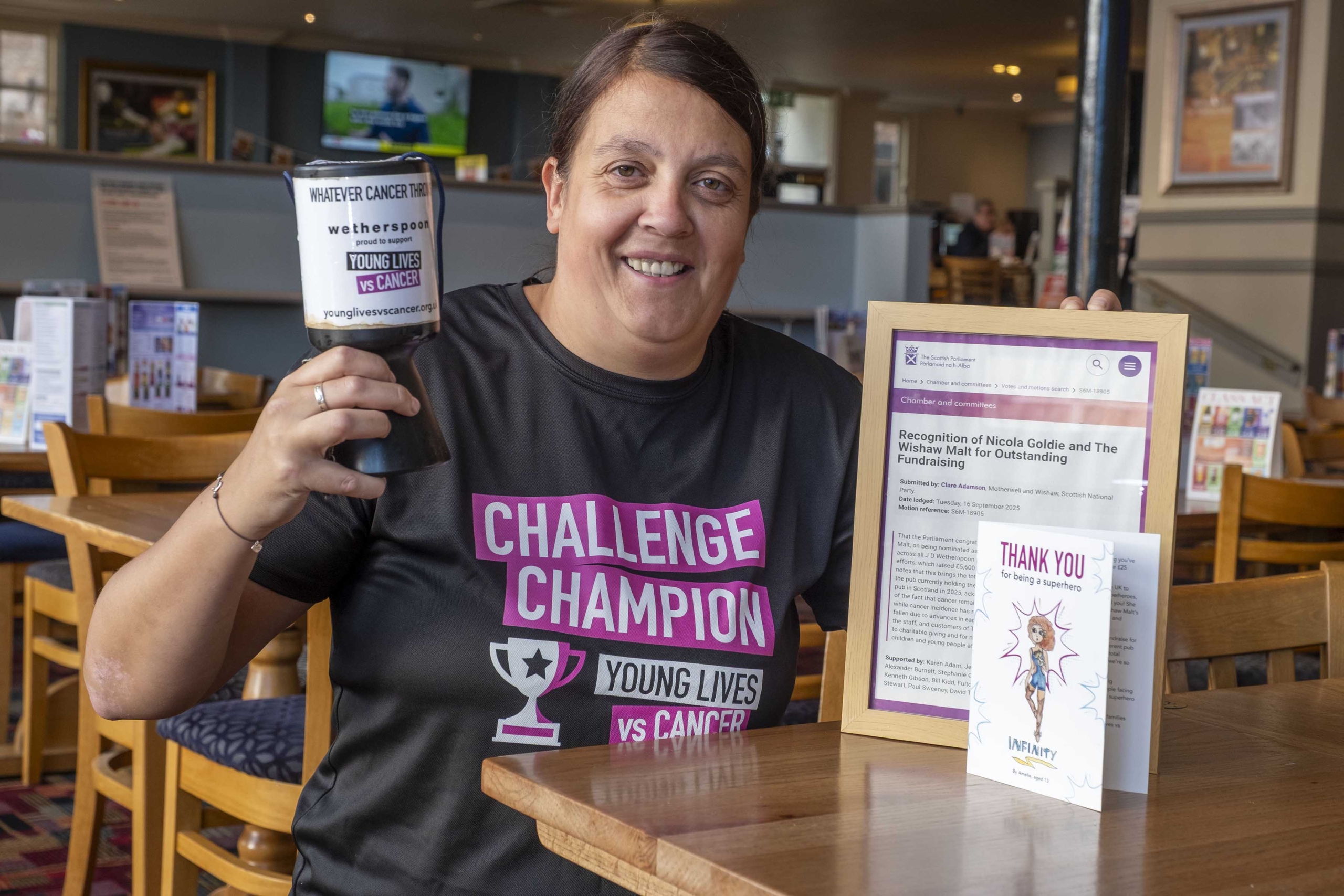 Clare Adamson MSP (Scottish National Party) Motherwell and Wishaw put forward a motion stating that the parliament congratulates Nicola Goldie, shift manager at The Wishaw Malt, on being nominated as one of only three fundraising superheroes from across all of J D Wetherspoon’s pubs in the UK.