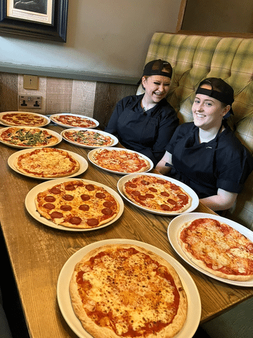 Just kidding! Here, Ellie and Katie are taking part in one of our new face-to-face kitchen-of-excellence training sessions, learning more about the kitchen operation, meeting colleagues, having fun and, of course, seeing who can make the best pizza!