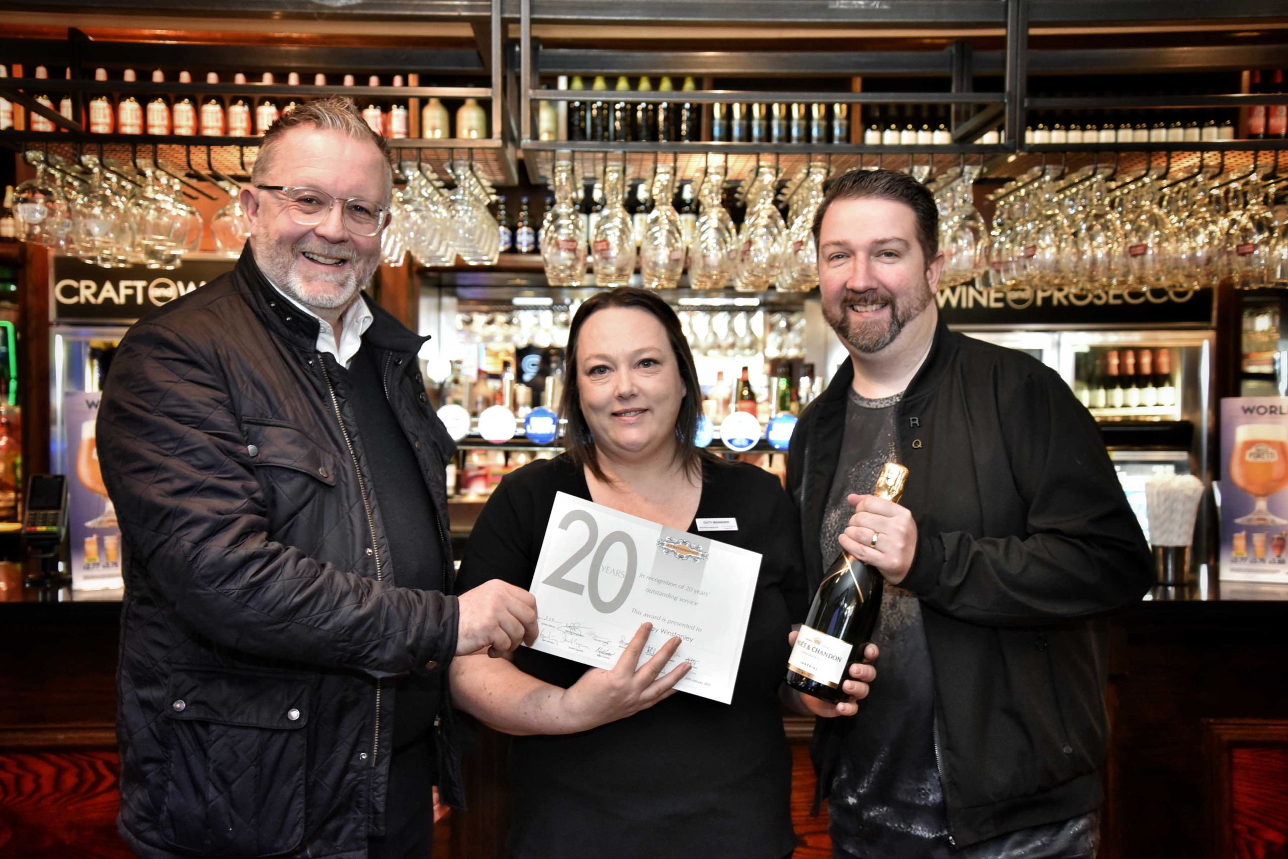 Shift manager Lindsey is pictured receiving her 20 years’ service certificate and a bottle of Champagne from area manager Mike and The Moon Under Water pub manager Dave.