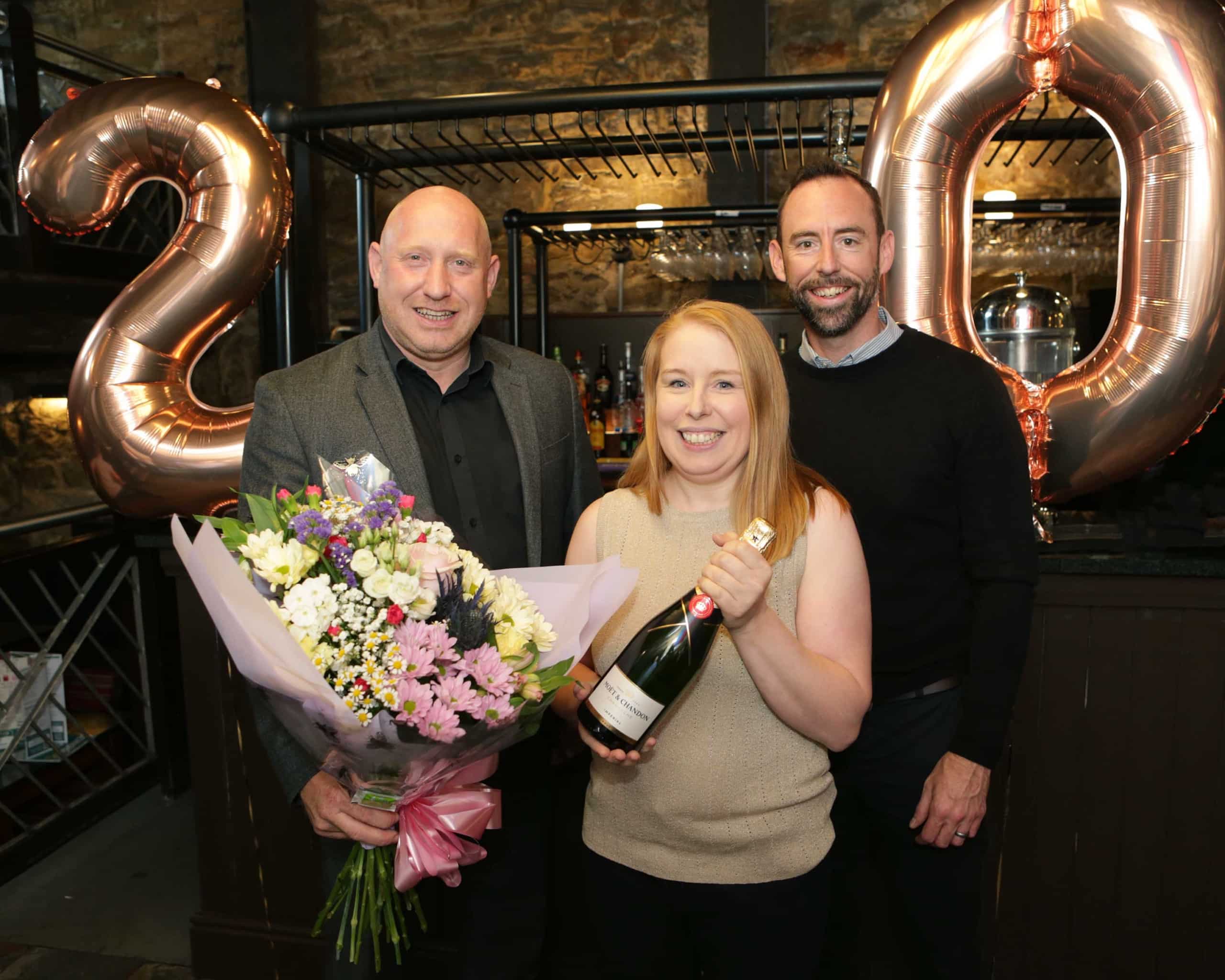 Kitchen manager Lindsey Bell is pictured receiving Champagne and flowers to celebrate 20 years with Wetherspoon.