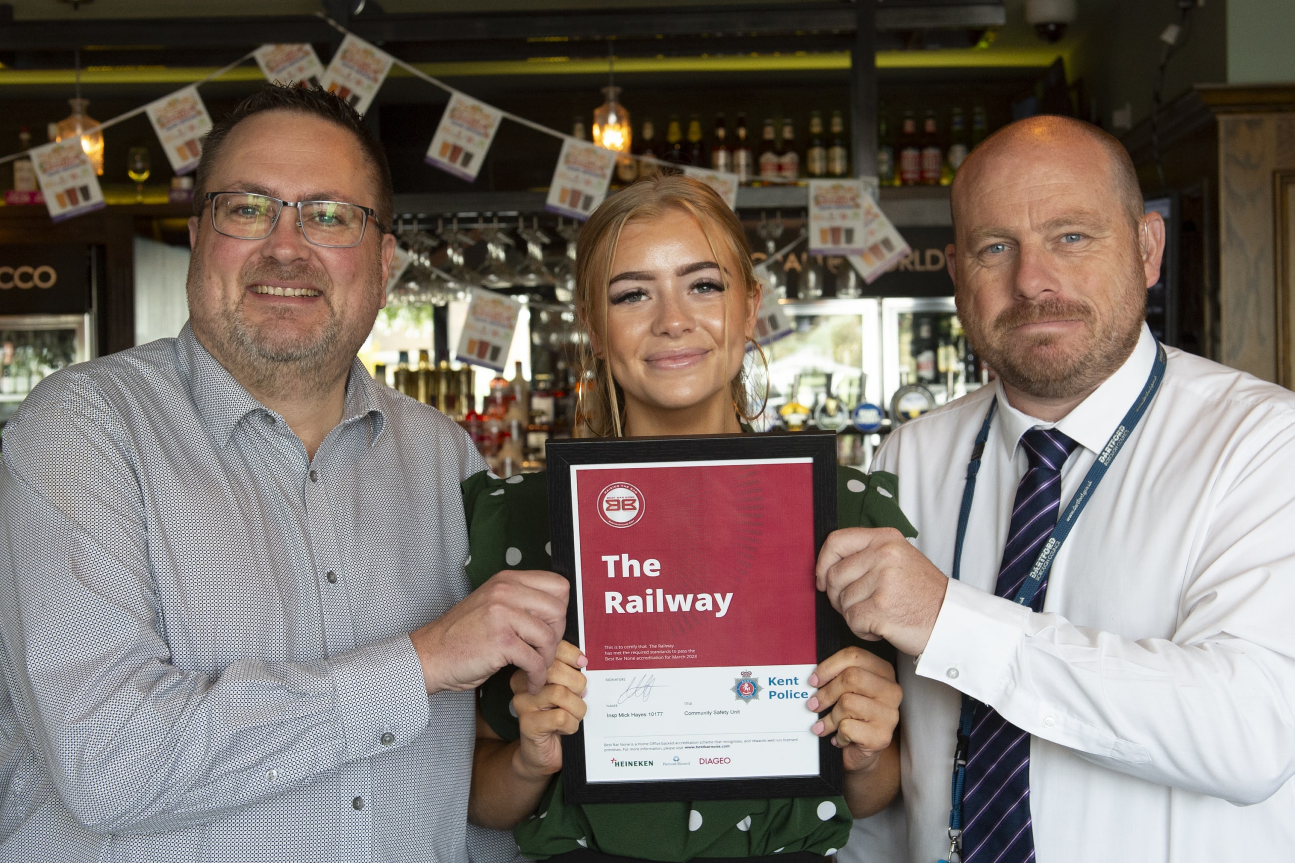Pictured are area manager Peter and pub manager Rosie receiving their Best Bar None accreditation certificate from Kent Police’s licensing officer.