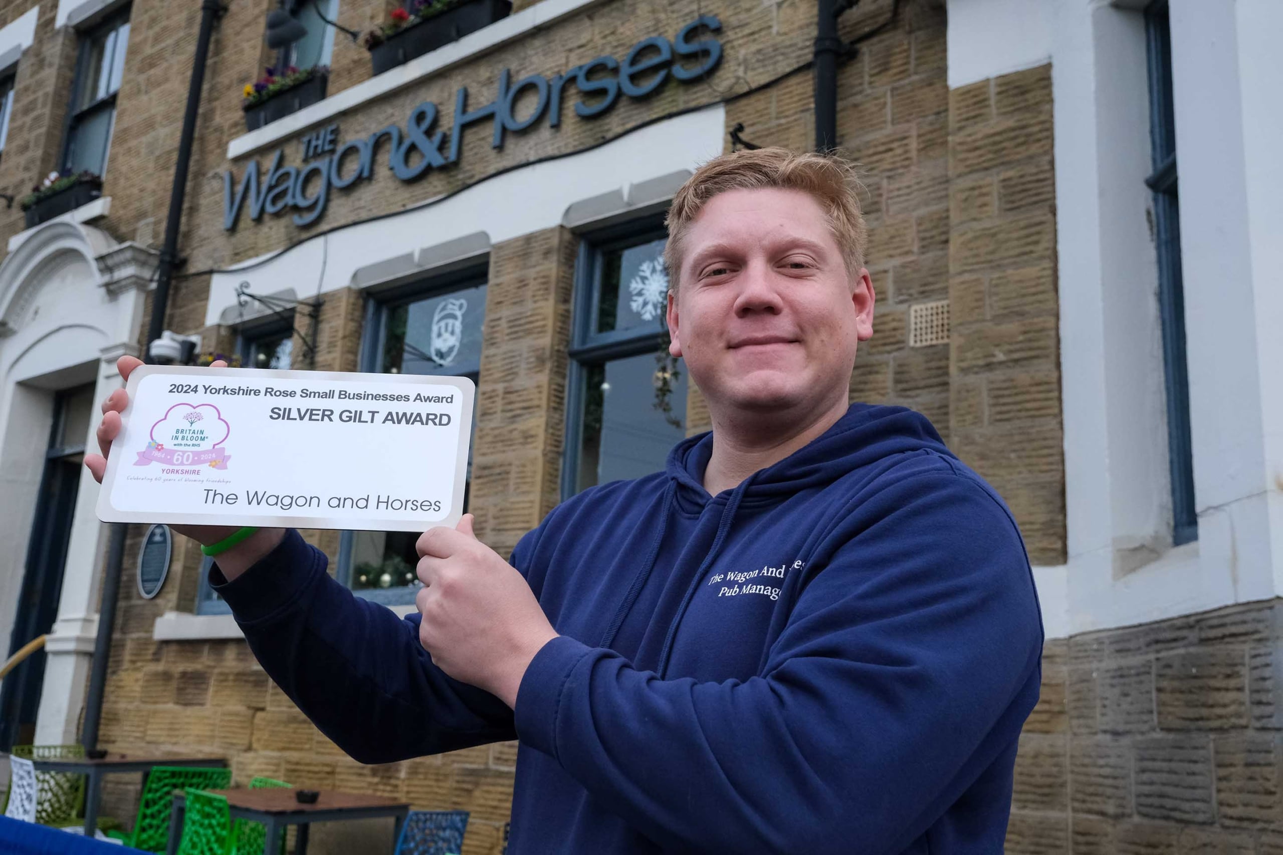 Pub manager Peter is pictured proudly holding a silver gilt award for renovation work on the side garden at The Wagon & Horses.